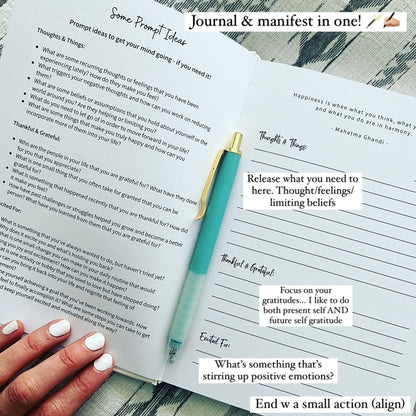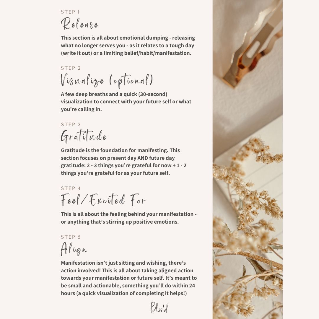 Our format covers the foundations for journaling and manifestation and provides predictability, guiding you through exploring your thoughts, gratitudes and excitements.